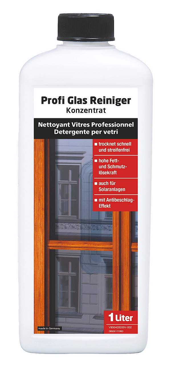 Konzentrat! Verhindert schnelle Wiederanschmutzungen. Streifen- und schlierenfreie Reinigung mit hoher Fett- und Schmutzlösekraft. Entfernt auch hartnäckige Verschmutzungen wie Fettfilme, Hautfette, Emissionen, Nikotinablagerungen und Fliegenverschmutzungen. Verhindert durch Anti-soiling-Effekt schnelle Wiederanschmutzung. Erzeugt auf Spiegeln oder Brillengläsern einen Antibeschlageffekt.