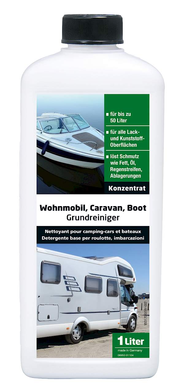 Hochkonzentrierter Grundreiniger für hartnäckigen Schmutz auf strukturierten Oberflächen. Sehr effektive Beseitigung von hartnäckigen Ablagerungen, Straßen- und Umweltschmutz, Fett, Öl, Diesel, Insekten u.a. Belägen. Für alle Lack- und Kunststoffoberflächen von Wohnmobilen, Caravans, Booten u. v. m.. Bringt streifenfreien Glanz. Erhöht die Wasserabweisung und reduziert die Wiederverschmutzung. Biologisch abbaubar.
